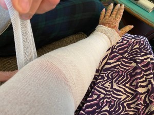 Meanwhile, my left arm is currently mummified, wrapped in a multi-layer compression wrap my lymphedema therapist recommended and showed me how to do. I’ll continue that for about two weeks. It seems to be helping, softening the fibrosis in my arm and moving some of the fluid. Hooray! Sadly, now I’ve got some additional fluid backup in my neck, so I’m trying to stay on top of that with manual lymphatic drainage massage. Some days it feels like I’m playing Whac-a-mole.